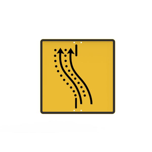 Señal de acero económica de obras en forma de rectángulo TS-62-A que indica en una calzada con cuatro carriles de circulación en el mismo sentido, que se producirá una bifurcación con cambio de dirección en el carril derecho.