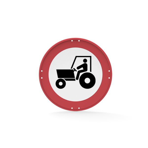 Señal de acero económico en forma de disco R-111. Señal de prohibición que indica entrada prohibida a vehículos agrícolas de motor.